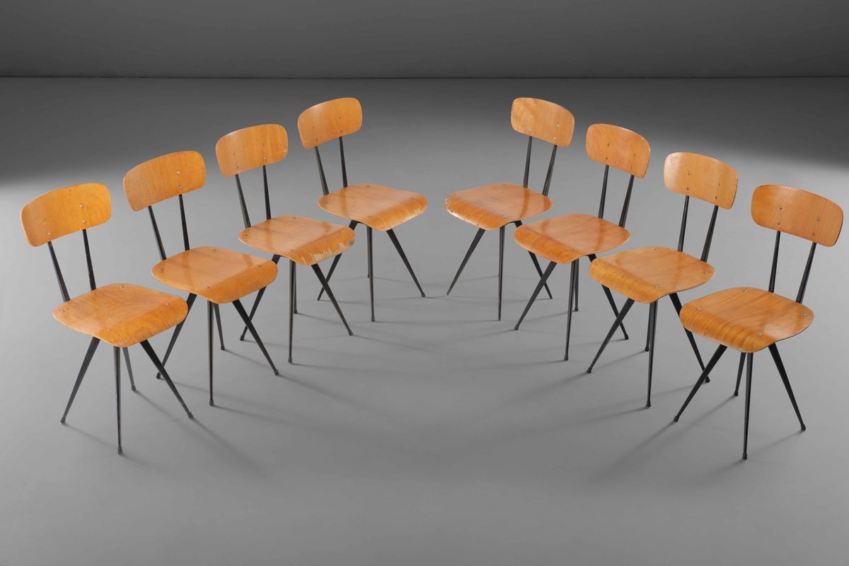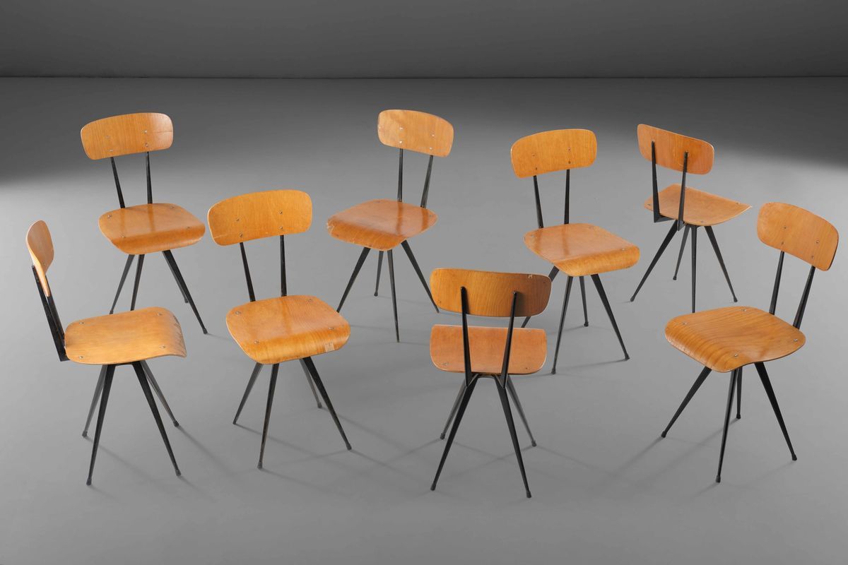Otto sedie con sostegno in ottone e metallo laccato. Seduta e schienale in legno compensato curvato.