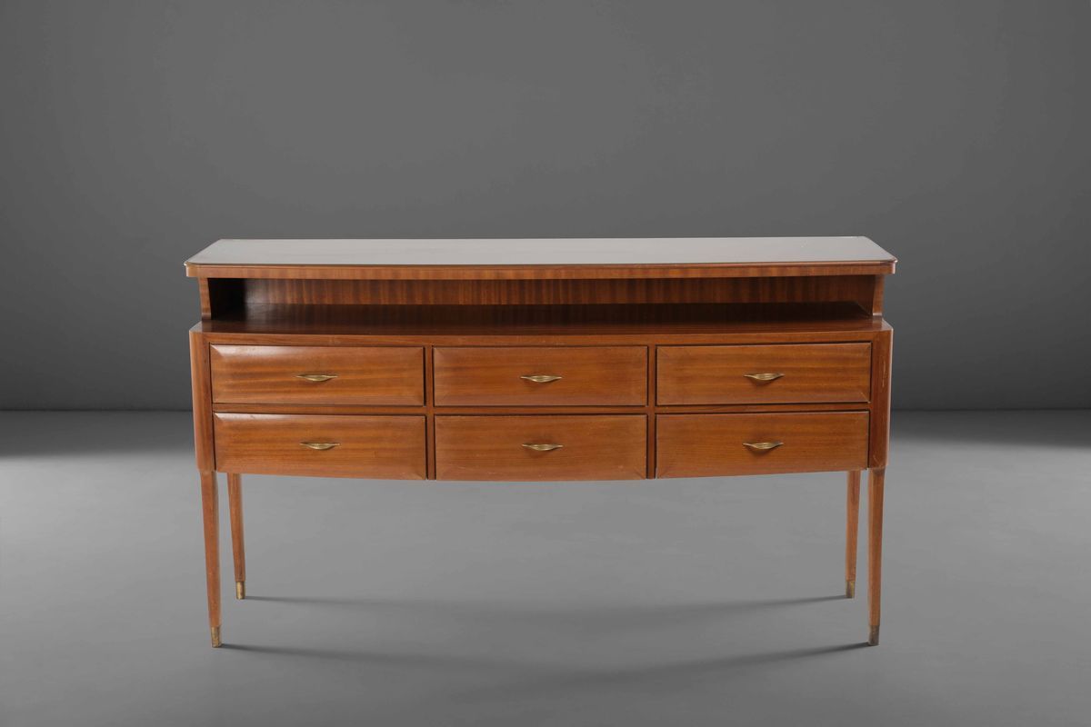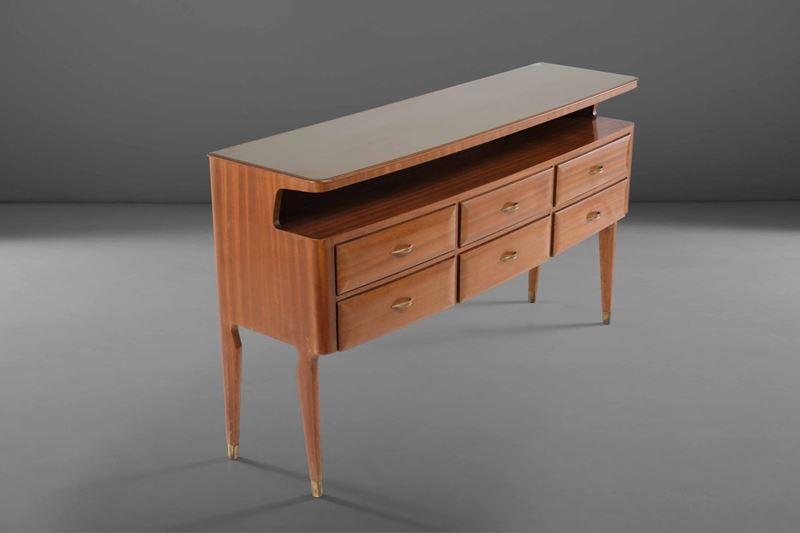 Mobile contenitore a cassettiera con struttura in legno e piano in vetro. Dettagli in ottone.