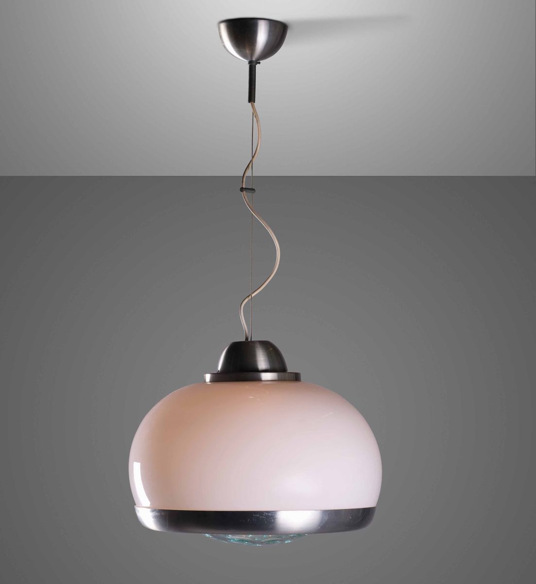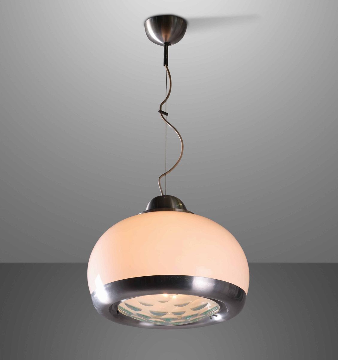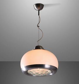 Lampada a sospensione con struttura in vetro opalino e metallo cromato, diffusore in cristallo molato.