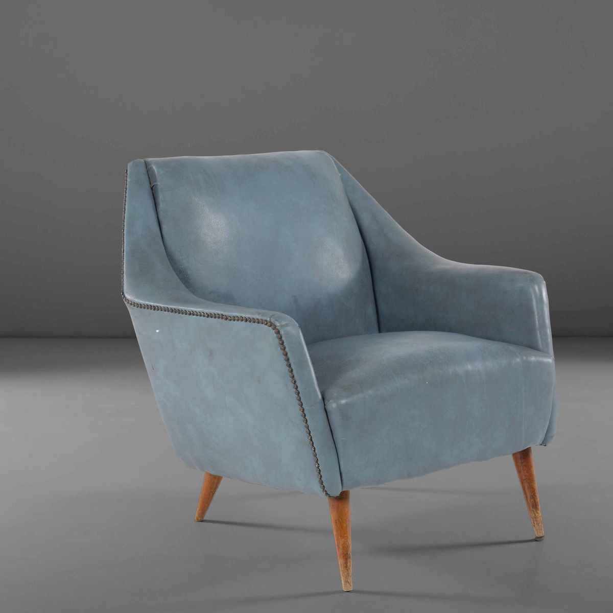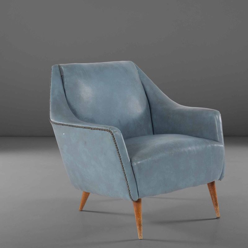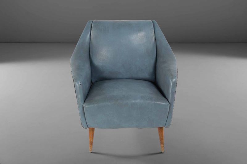 Poltroncina in skai con struttura in legno.