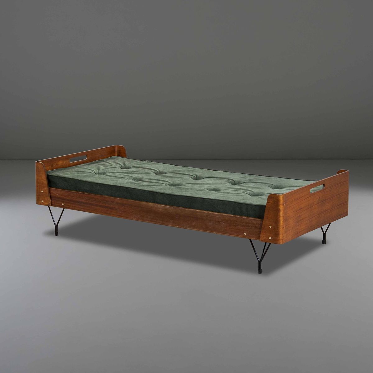 Daybed con sostegni in tondino di ferro laccato, struttura in legno, compensato curvato, particolari in ottone e rivestimento in velluto.