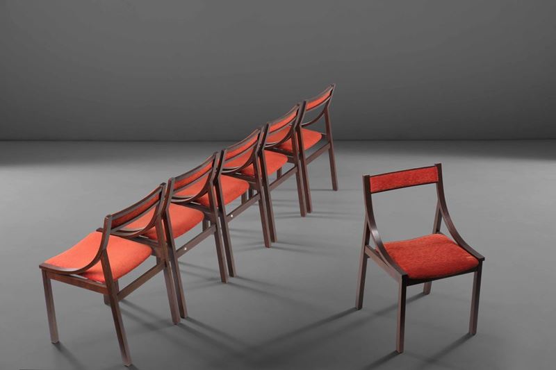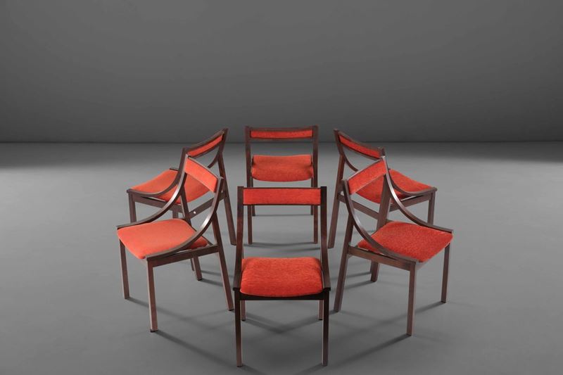 Sei sedie con struttura in legno e rivestimenti in tessuto.