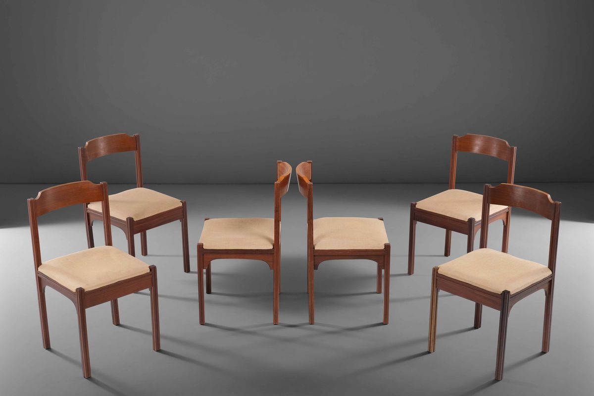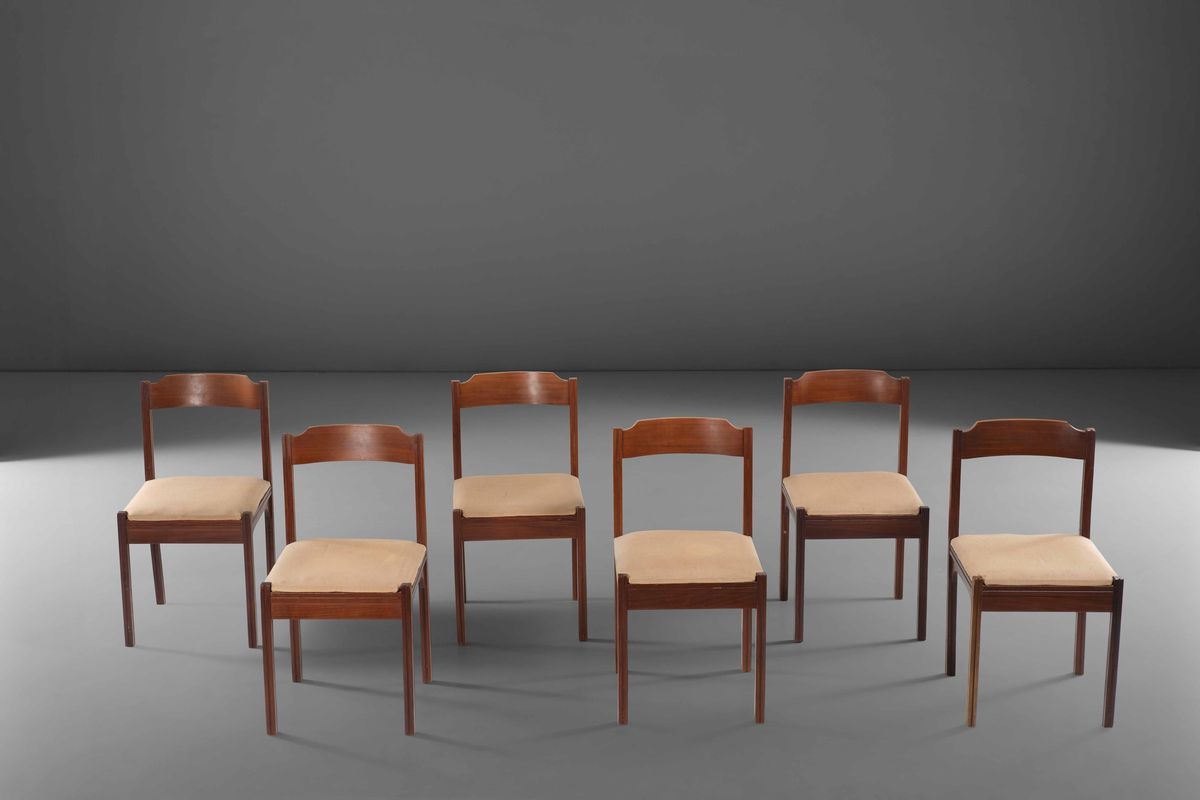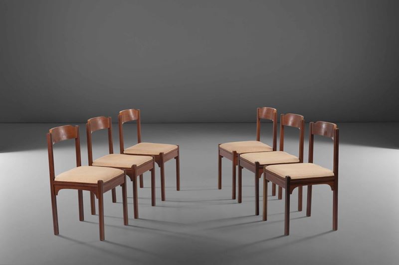 Sei sedie in legno con seduta in tessuto.
