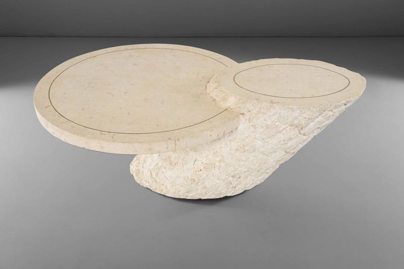 Tavolo basso con struttura in legno e pietra. Inserti in ottone.