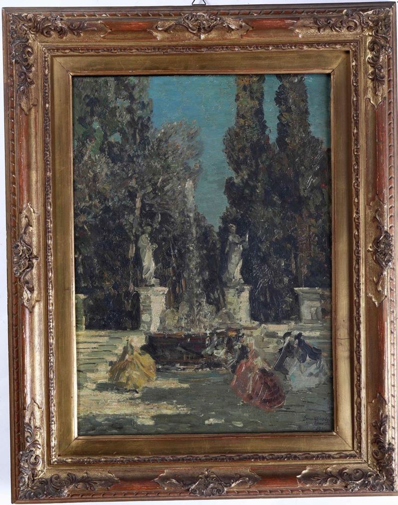Giardino con fontana e figure in abiti settecenteschi, 1911
