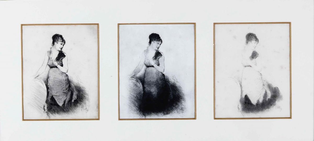 tre incisioni cm 23x19 cad, incorniciate in un'unica cornice cm 43x84
