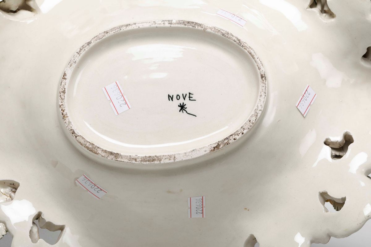 Maiolica policroma. Marca: “Nove” con stella filante in nero. Dimensioni: altezza cm 30,1; cm 35,5x37. Conservazione: qualche insignificante sbeccatura