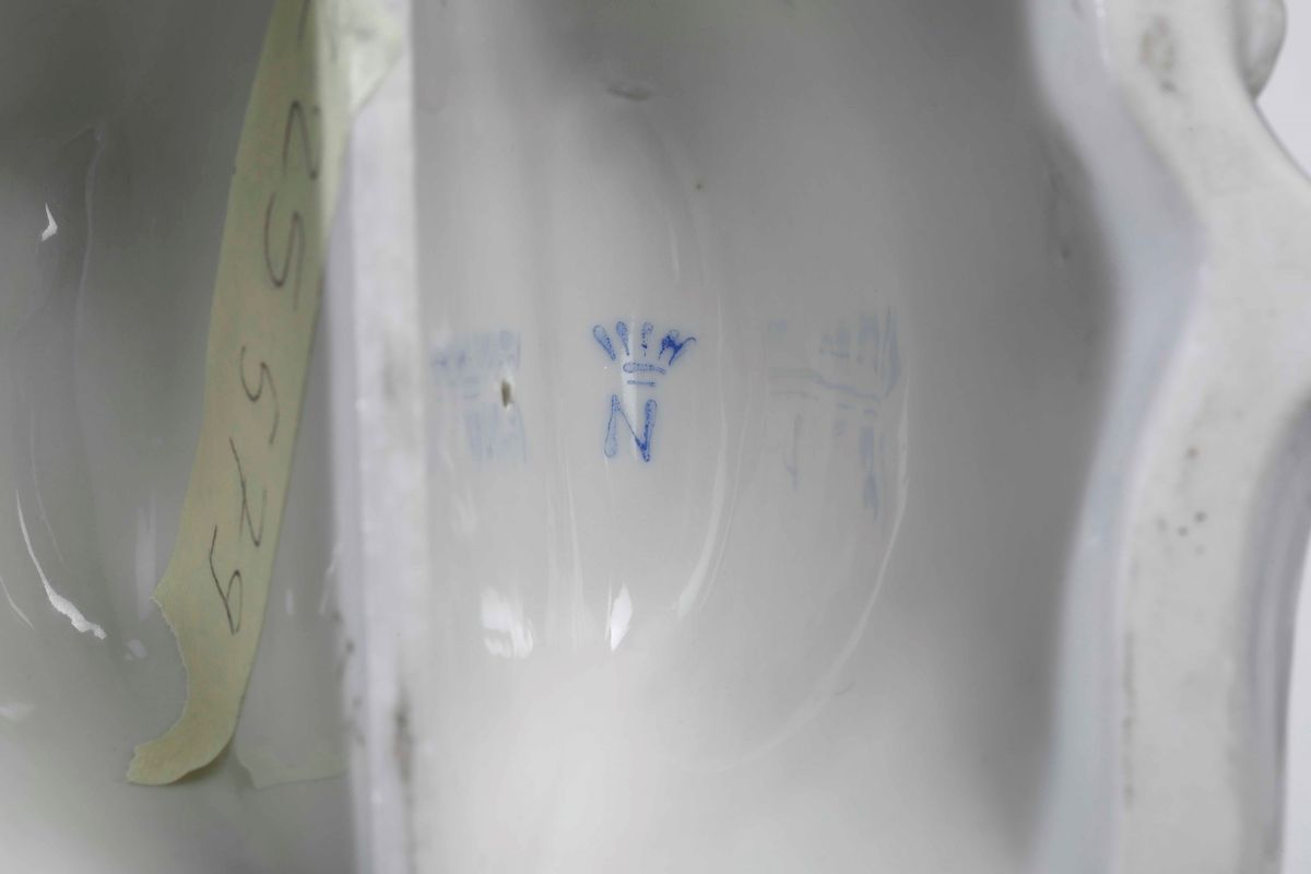 Porcellana policroma e dorata. Marca: “N” con corona in blu. Altezza cm 50 circa. Conservazione: buona; figura femminile con sbeccature e rotture all’estremità superiore del vaso e ad una treccia; figura maschile in ottimo stato; entrambe con minime sbeccature alla vegetazione