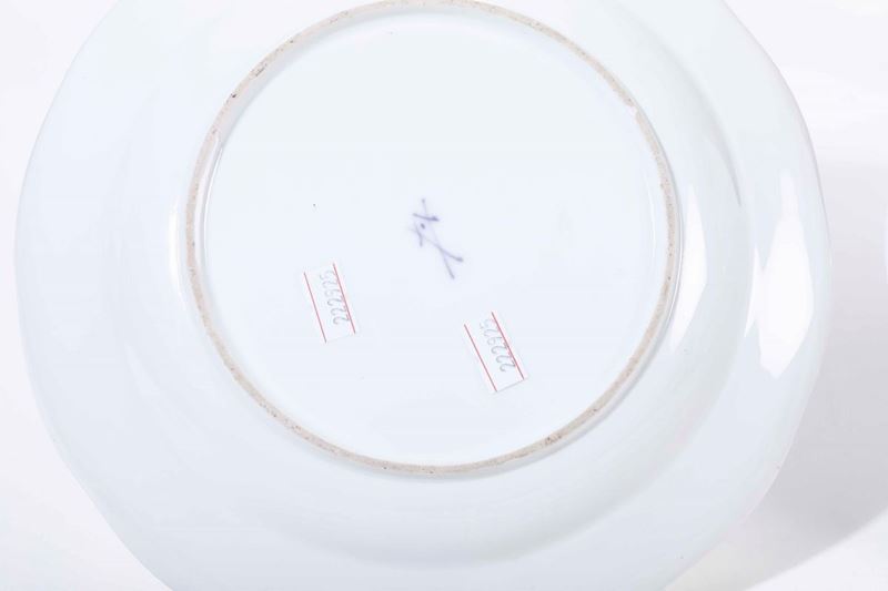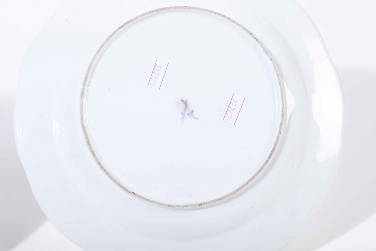Porcellana. Marca: spade incrociate con punto tra le else, in blu. Diametro cm 24. Conservazione: leggere usure all'oro