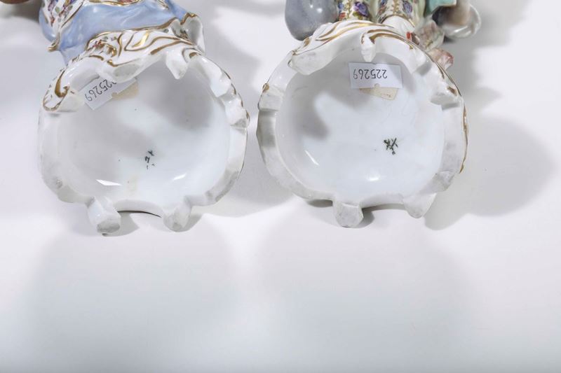 Porcellana policroma. Marca: spade in verde tracciate a freddo. Altezza cm 25 circa. Conservazione: la figura maschile rotta e ricomposta in restauro all’altezza delle caviglie, alla sommità del tronco, alle punte della pianta e all’innaffiatoio; la figura femminile con la mano sinistra e relativo fiore restaurati