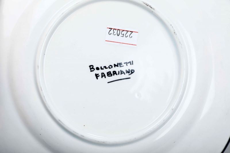 Terraglia. Marca: “Bolzonetti Fabriano” in nero. Diametro cm 20,5. Conservazione: ottima; qualche insignificante sbeccatura