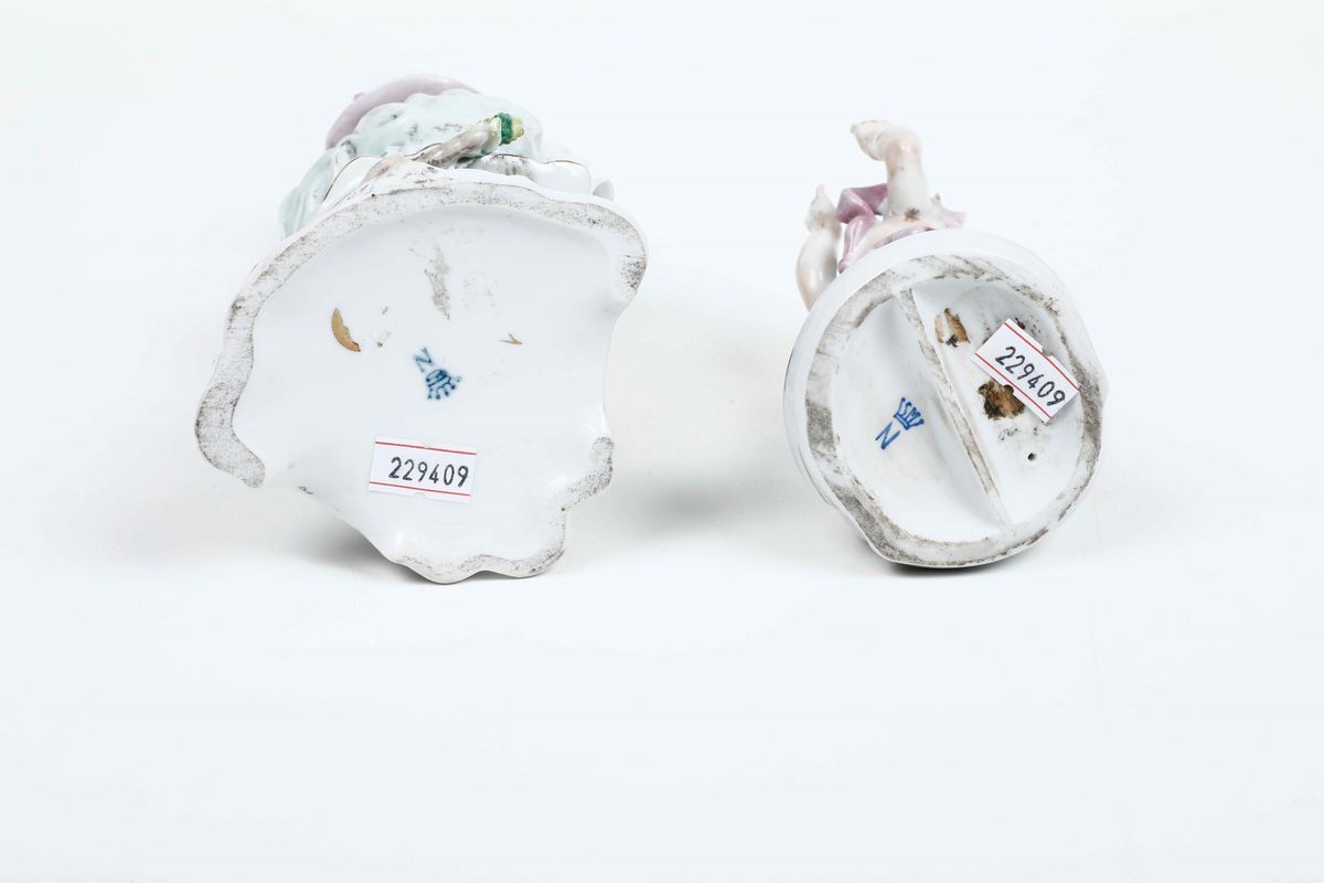 Al lotto si aggiunge un putto in porcellana, XX secolo, altezza cm 14. Marca: “N” coronata in blu. Conservazione: cestino staccato e importanti mancanze