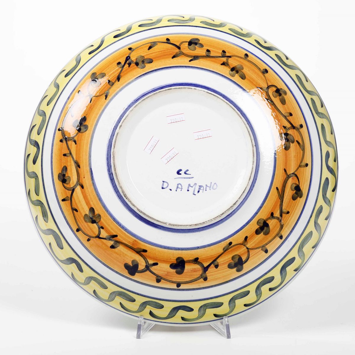 Maiolica decorata in policromia. Marca: “CC” e “D. A Mano” in blu. Dimensioni: altezza cm 8; diametro cm 39. Conservazione: ottima