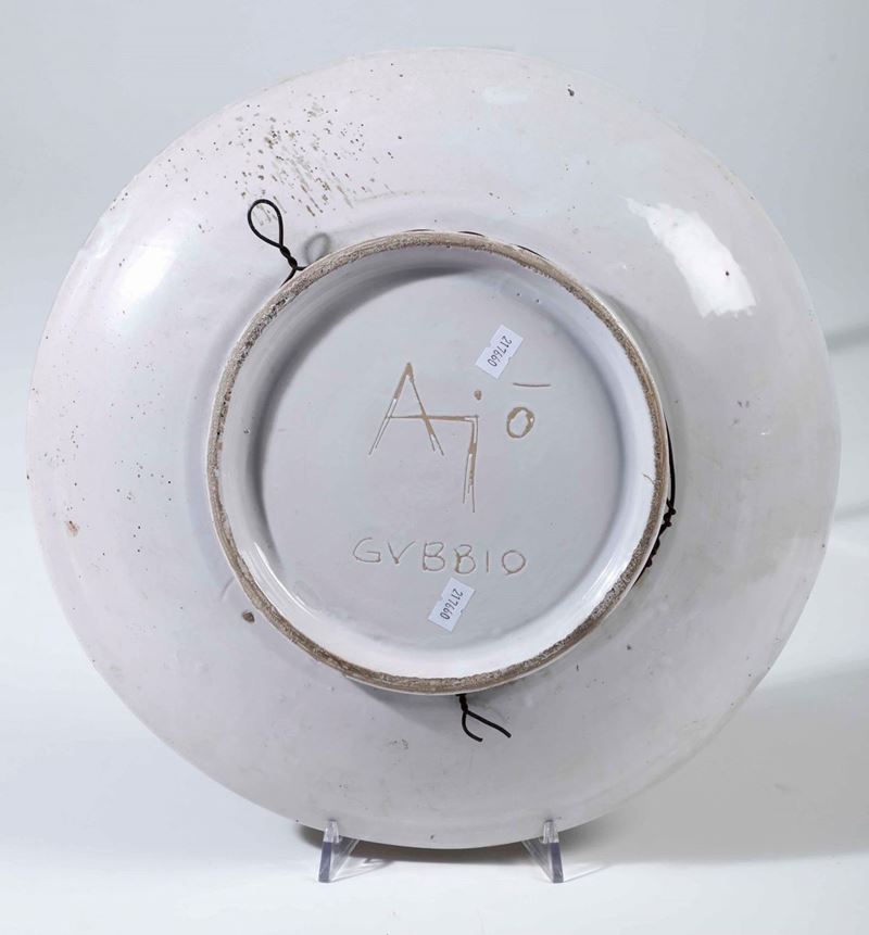 Maiolica. Marca: “Ajò Gubbio”. Altezza cm 7; diametro cm 37,5. Conservazione: ottima