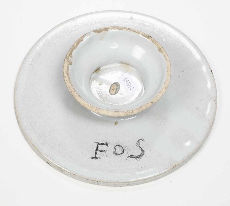 Maiolica a gran fuoco. Marca: assente; FoS incisa. Altezza cm 4,5 circa; diametro cm 19,8. Piccole sbeccature al bordo