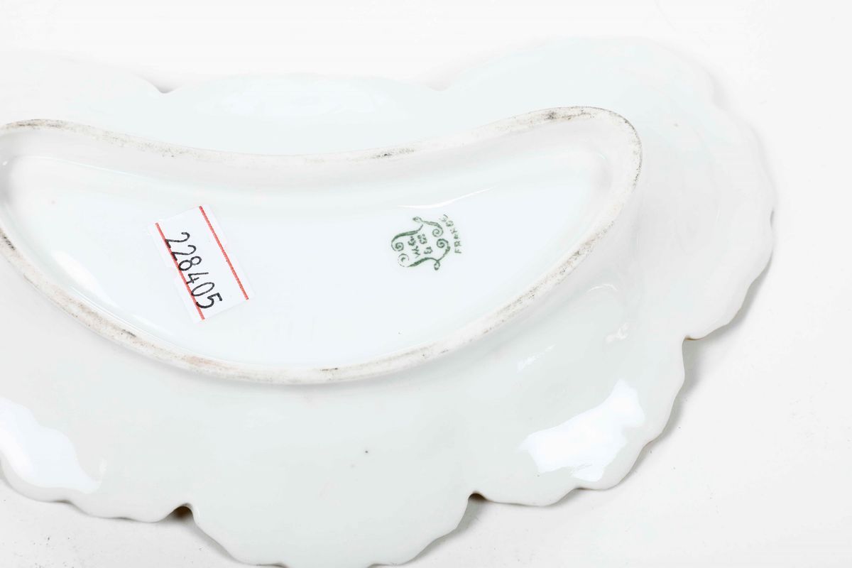 Al lotto si aggiunge 1 vassoio e 10 piattini a mezzaluna in porcellana di Limoges seconda metà del XIX secolo. Conservazione: ottima; leggere usure all’oro
