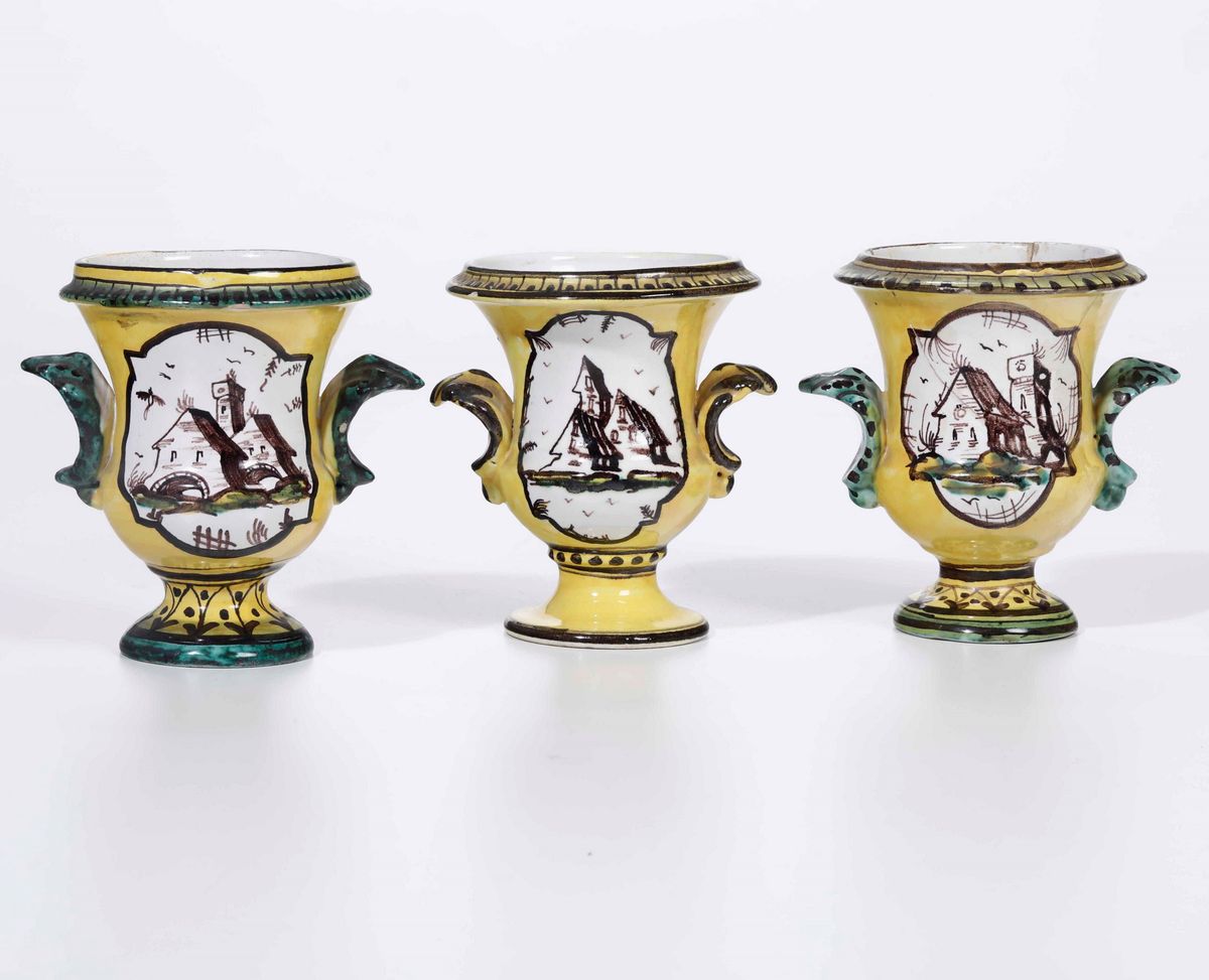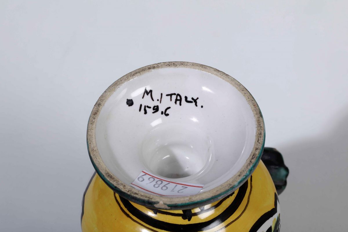 Maiolica. Marca: “A.L.” con globo e croce; “M Italy 159.6” in manganese. Altezza cm 11,6. Conservazione: sbeccature al bordo; un vasetto rotto in 5 pezzi e rincollato
