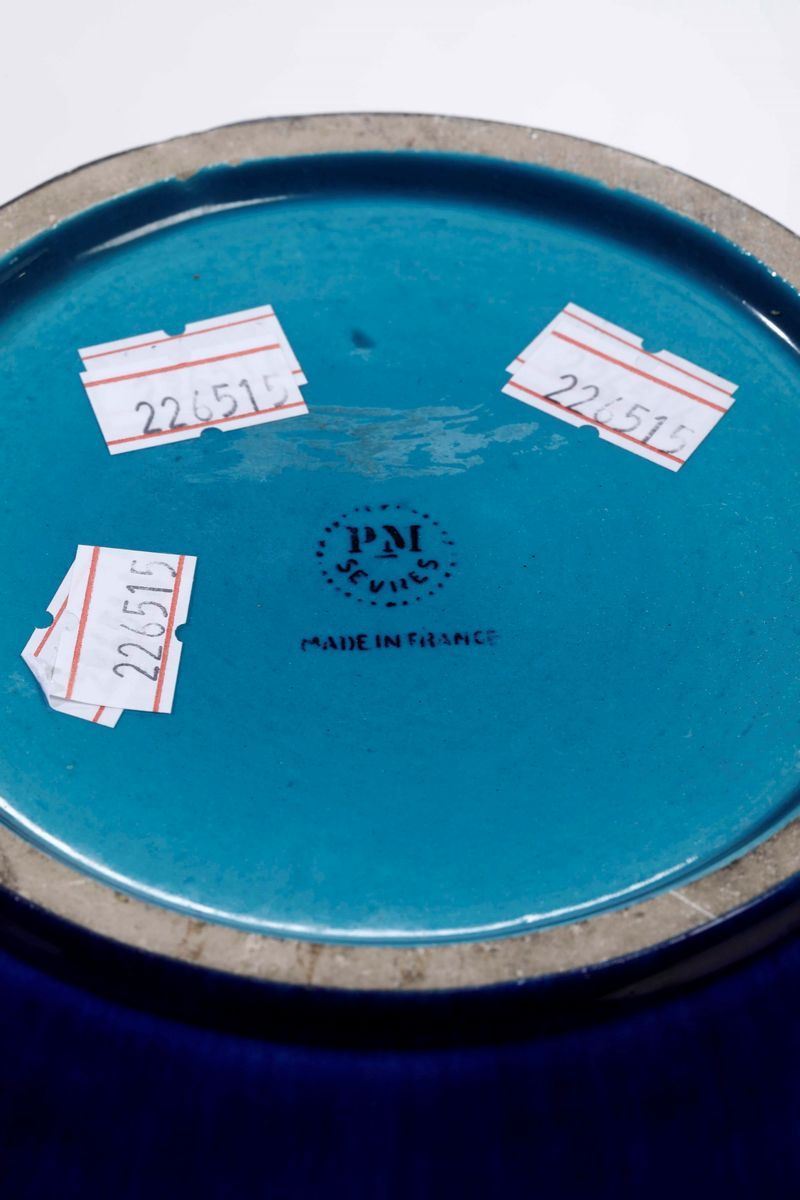 Porcellana a fondo blu marmorizzato. Marca: “PM SEVRES” in un cerchio puntato e “Made in France”, in blu. Altezza cm 28. Conservazione: un paio di insignificanti sbeccature al bordo.