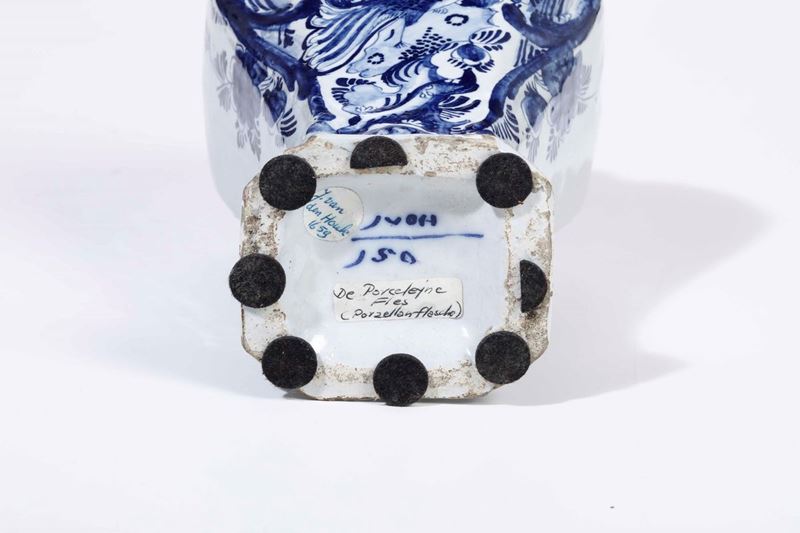 Maiolica. Marca: “JVOH” e “JSO”, in blu. Altezza cm 35,3. Conservazione: coperchio con restauri; insignificanti sbeccature