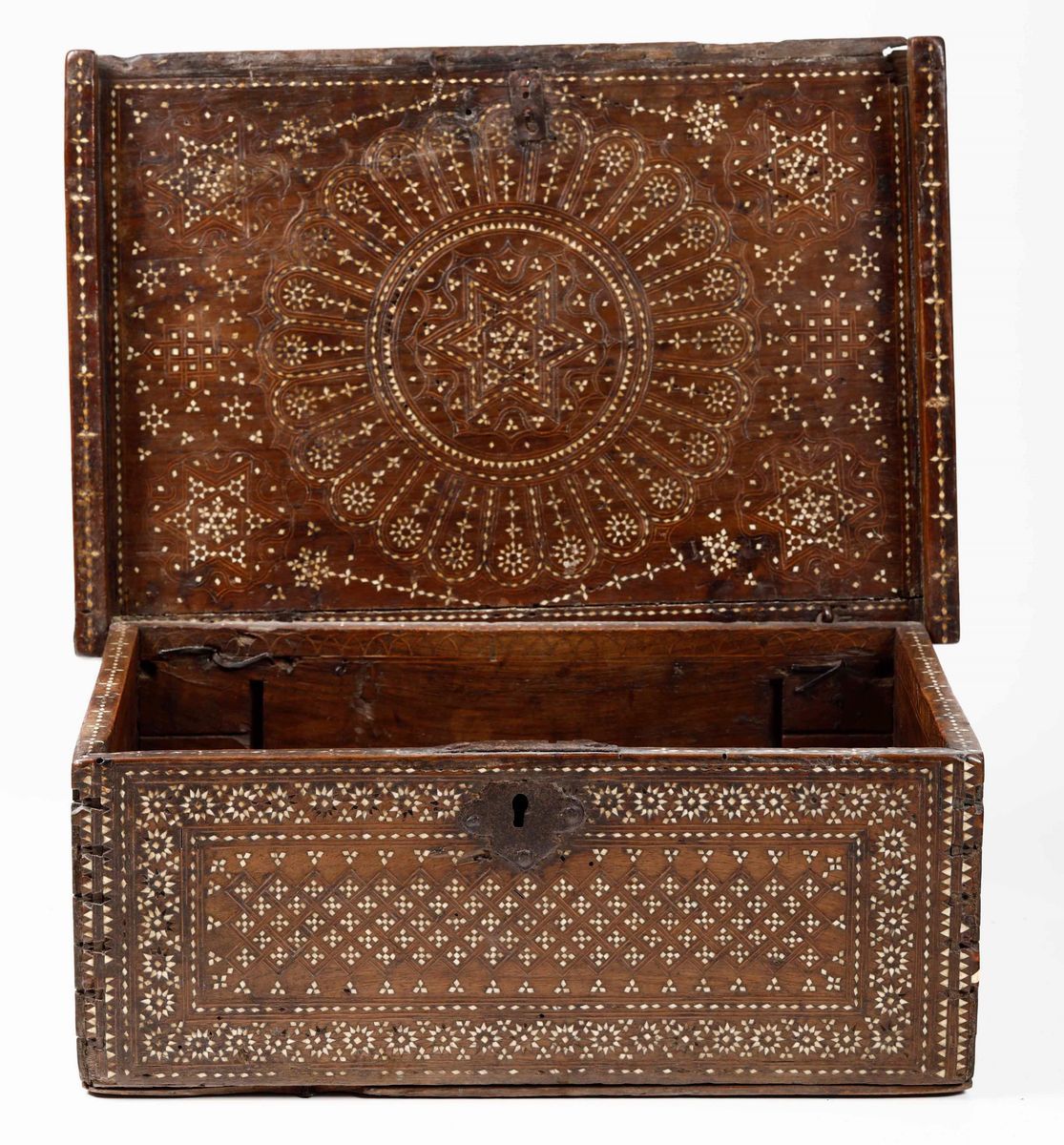 Corpo rettangolare con intarsi in legno e osso a motivi geometrici, girali e riserve.