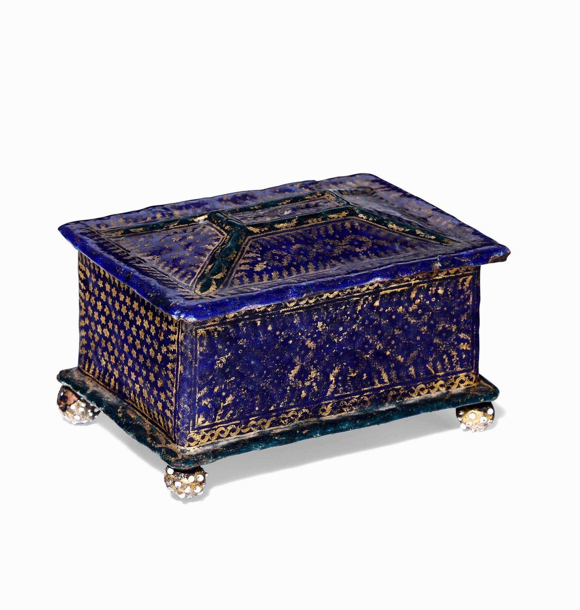 Forma rettangolare con fondo a smalti blu cobalto e verde oltremare, un coperchio a urna suddiviso a quartieri. Base aggettante con piedi a sfera.