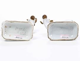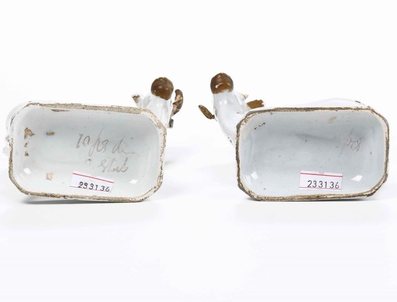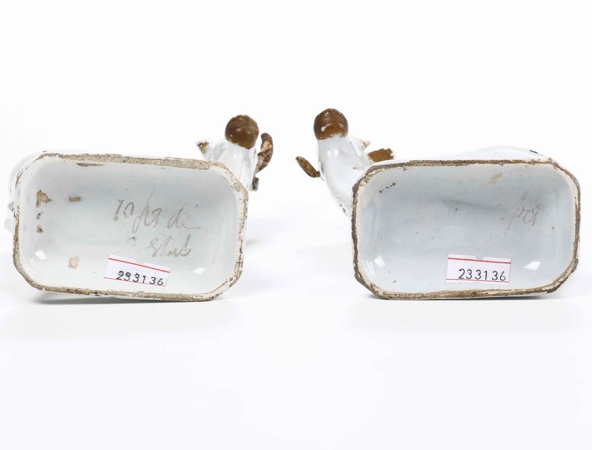 Maiolica. Marca: assente. Altezza cm 10 circa. Conservazione: 2 orecchie mancanti e 1 con vecchio restauro; 3 corna mancanti e 1 restaurato; 2 zampe per ogni pezzo con felature; 2 capezzoli mancanti; usure alla policromia