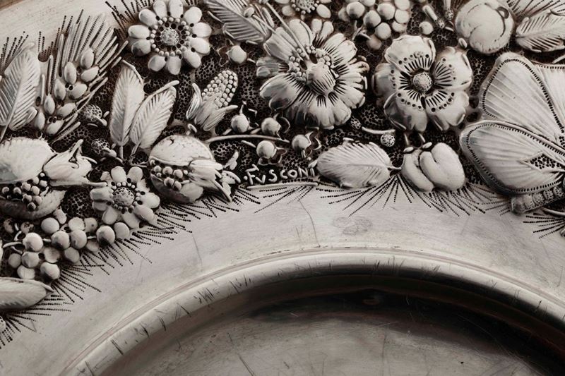 Coppia di grandi piatti Argento fuso e sagomato Argenteria artistica italiana del XX secolo. Firmati Fusoni