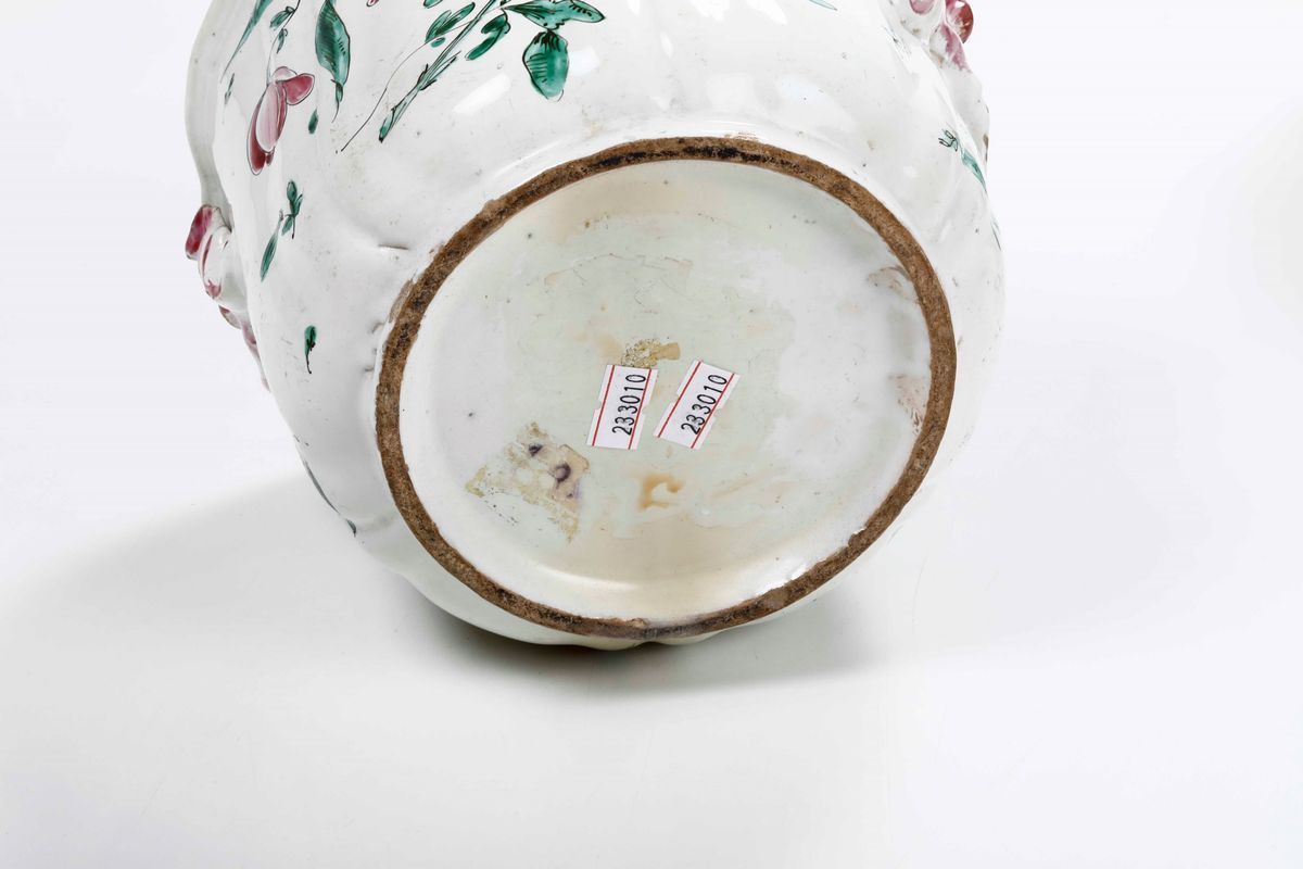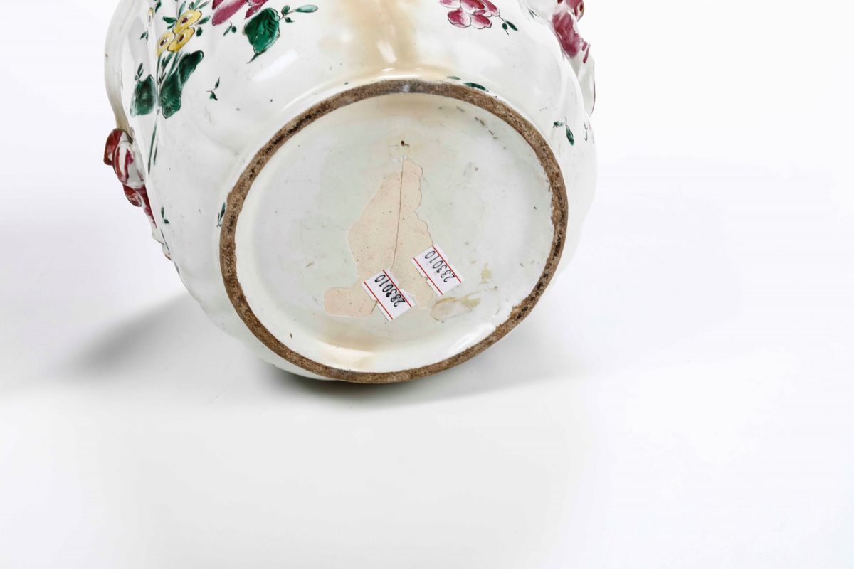Maiolica. Marca: assente. Dimensioni: altezza cm 15; diametro cm 19. Conservazione: i due pezzi con felatura e sbeccature ai bordi riparate con vecchio restauro