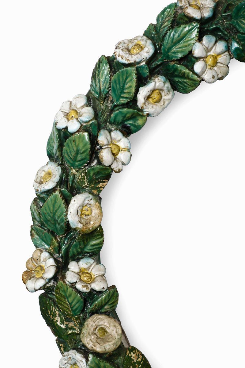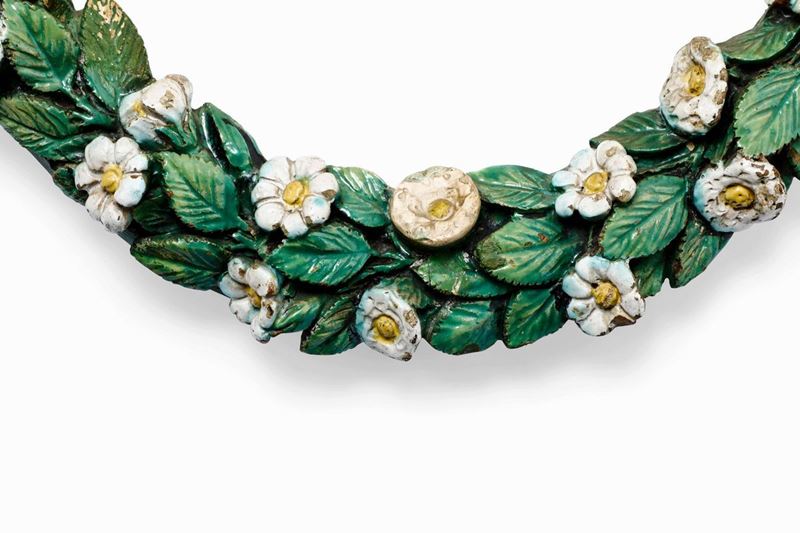 La cornice rotonda, costituita da una ghirlanda di tralci con fiori e foglie modellate ad altorilievo, era destinata ad incorniciare medaglioni araldici, rilievi con raffigurazioni sacre o profane