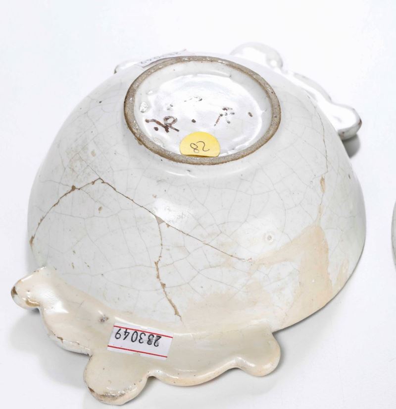 Ciotola a calotta emisferica, su piede ad anello, con due prese laterali trilobate, rivestita di smalto stannifero e decorata in stile compendiario con una figura femminile classica, seduta davanti ad un albero, in un paesaggio e con due cherubini dipinti sulle anse