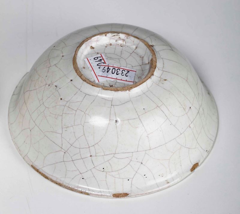 Maiolica decorata con colori a gran fuoco. Dimensioni: altezza cm 5,2 circa; diametro cm 12,5 circa