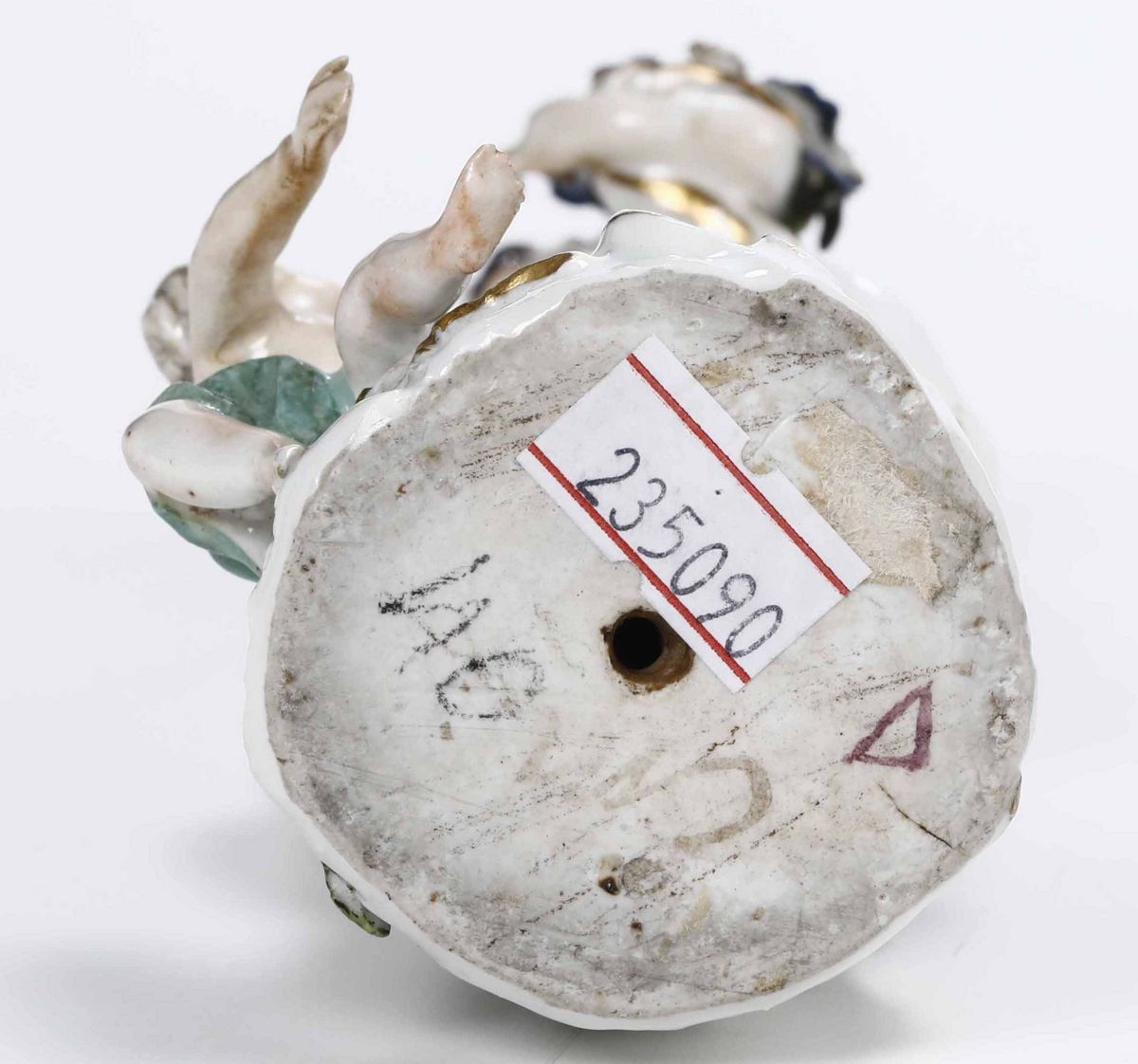 Porcellana policroma. Marca: spade in blu sulla base. Altezza cm 14,8. Conservazione: braccio destro del putto ricomposto in restauro; mancanza alla punta della cornucopia; sbeccatura al mantello