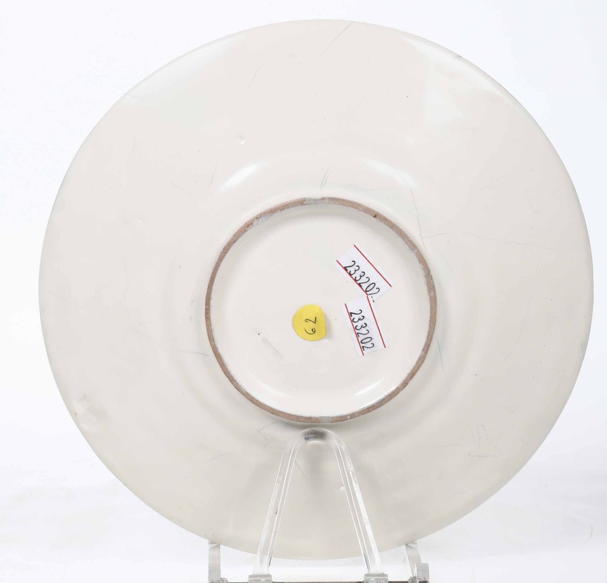 Maiolica decorata con colori a gran fuoco. Marca: assente. Diametro cm 20,8. Conservazione: rotto in più frammenti e ricomposto in restauro