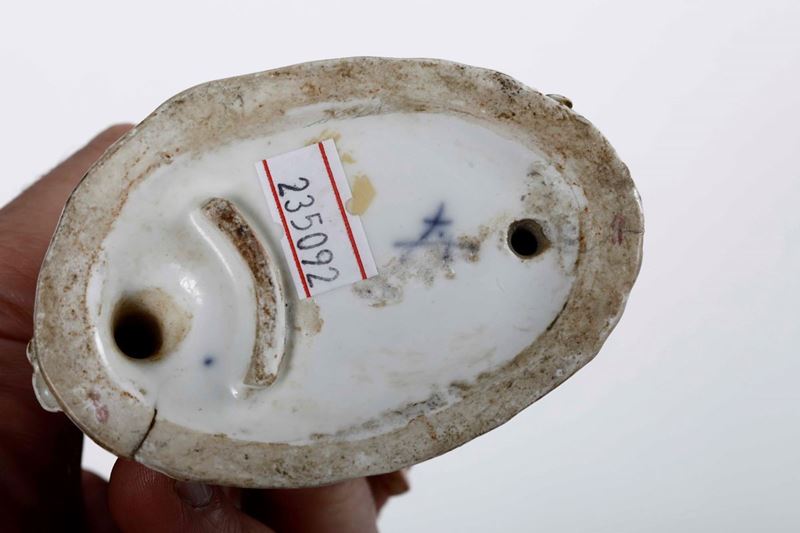 Porcellana policroma. Marca: spade con punto tra le else in blu. Altezza cm 16. Conservazione: restauri alle foglie della palma; mancanze minori alla vegetazione. Base in bronzo dorata probabilmente coeva