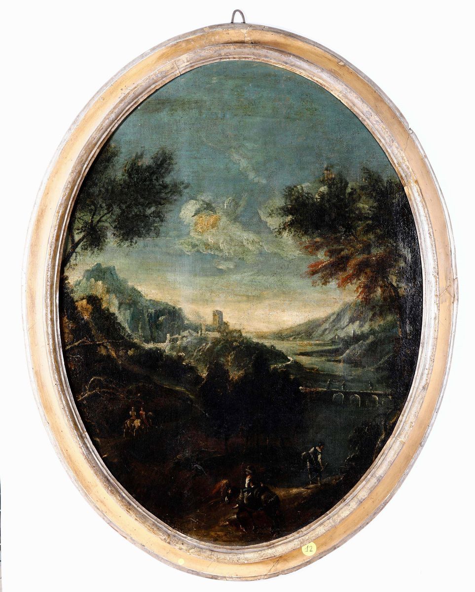 Salvator Rosa (Napoli 1615 - Roma 1673), nei modi di Paesaggi con fiumi e cavalieri