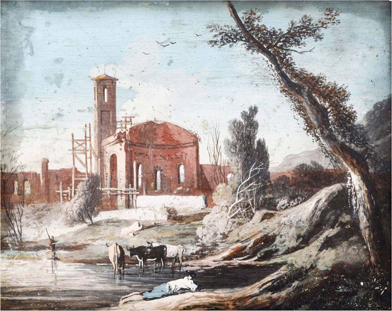 Scuola italiana del XVIII secolo Paesaggio con capriccio architettonico