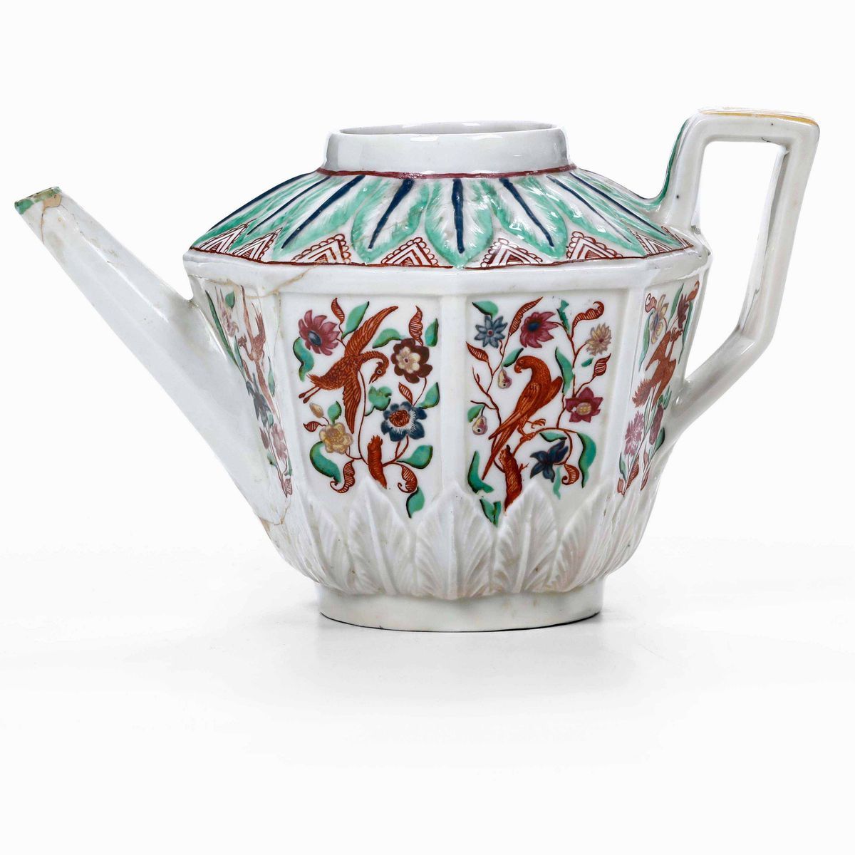 Questa teiera ha la tipica forma ottagonale a specchiature ed è decorata a rilievo con due ordini di grandi foglie lanceolate dalle forti nervature. Il primo, lasciato in bianco, è posto attorno alla base e il secondo, sulla spalla, è dipinto in blu e verde. Ogni specchiatura è impreziosita da esili steli fioriti e fogliati in policromia tra cui appaiono volatili. Notevole la raffigurazione di una civetta