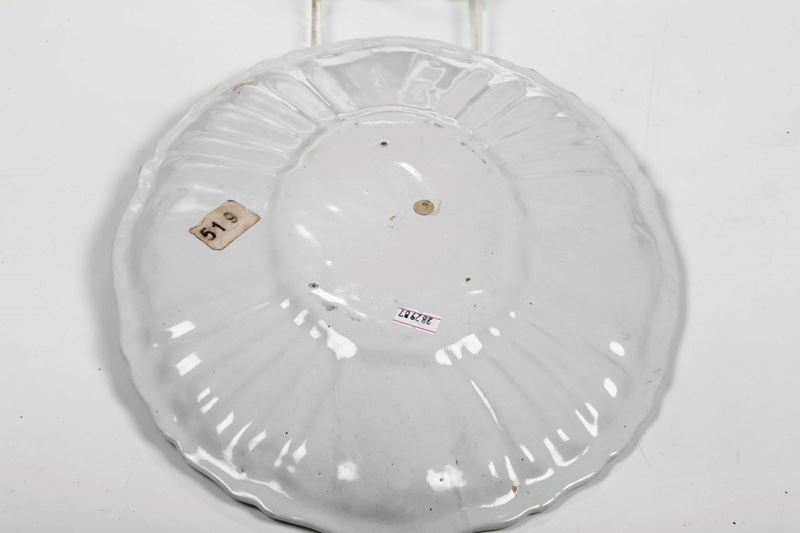Maiolica. Marca: assente. Diametro massimo cm 39,7. Conservazione: ottima; il piatto rotondo a blanser restaurato