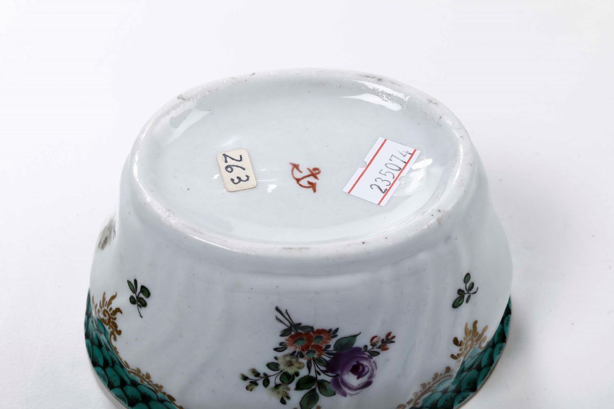Questa zuccheriera ovale dal tipico modello rococò a pareti costolate mosse e coperchio cuspidato con presa a fruttino con foglia, è decorata “a squama verde” incorniciata da volute rocailles e foglioline dorate. L’ornato pittorico policromo sul resto della superficie è a ramoscelli fioriti sparsi e semis di foglioline