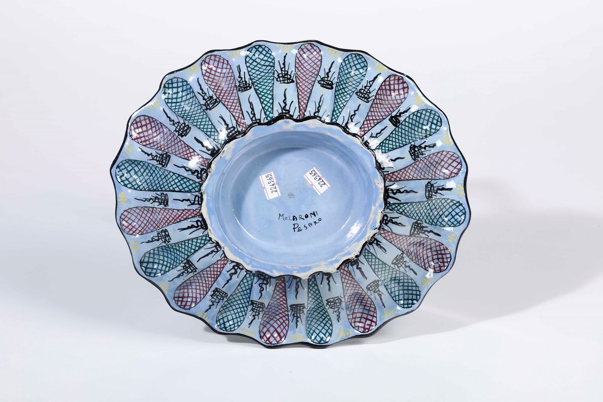 Maiolica. Marca: Molaroni Pesaro in nero. Dimensioni: altezza cm 7,5; cm 31x26,8. Conservazione: insignificanti salti di smalto alla base