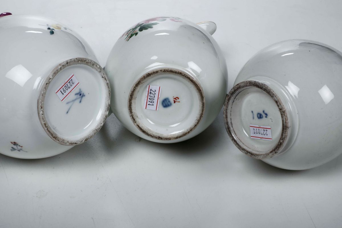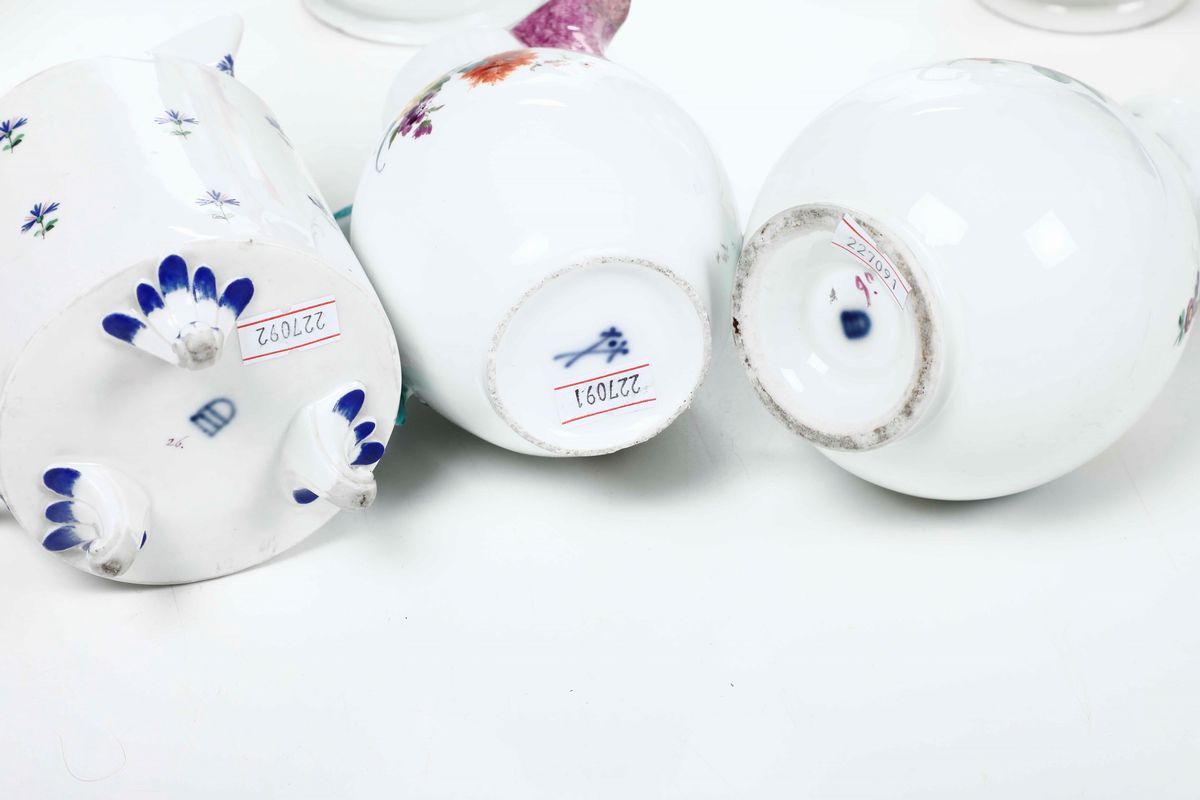 Porcellana policroma. Marche diverse. Altezza massima cm 18,3. Conservazione: qualche sbeccatura; qualche minima felatura; minimo restauro; usure all’oro