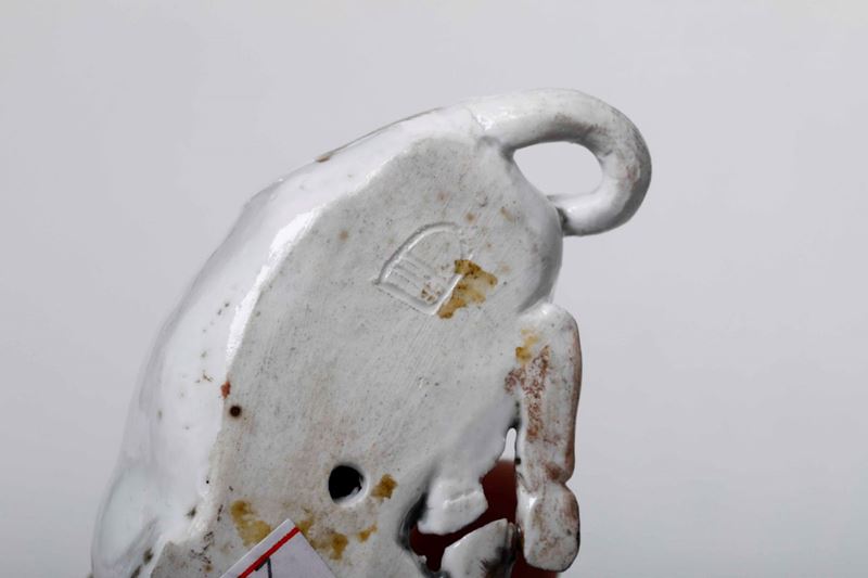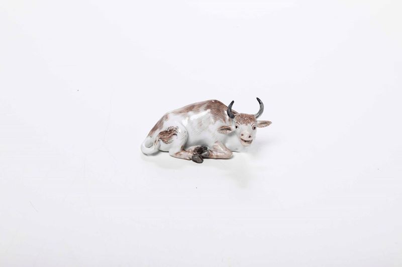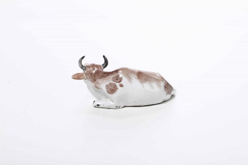 Porcellana policroma. Marca: scudo inciso. Dimensioni: altezza cm 4,4; cm 9,6x5. Conservazione: ottimo stato; punte delle corna con restauro e mancanza