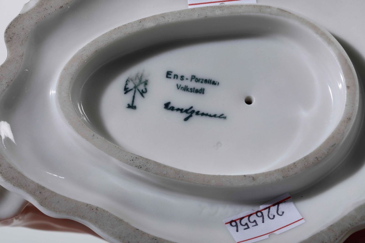Porcellana policroma. Marca: simbolo grafico della manifattura con mulino a vento e lettere “ENS”, “ENS-Porzellan Volkstedt Handgemalt” in verde. Altezza cm 32. Conservazione: ottima; parte dell’indice della mano destra mancante