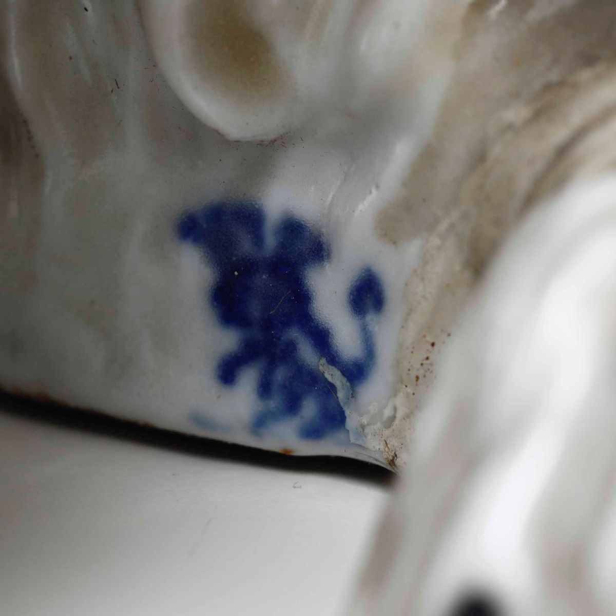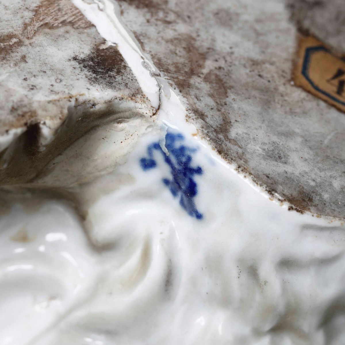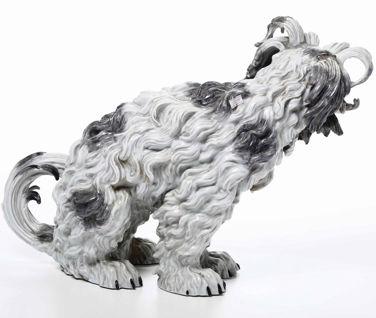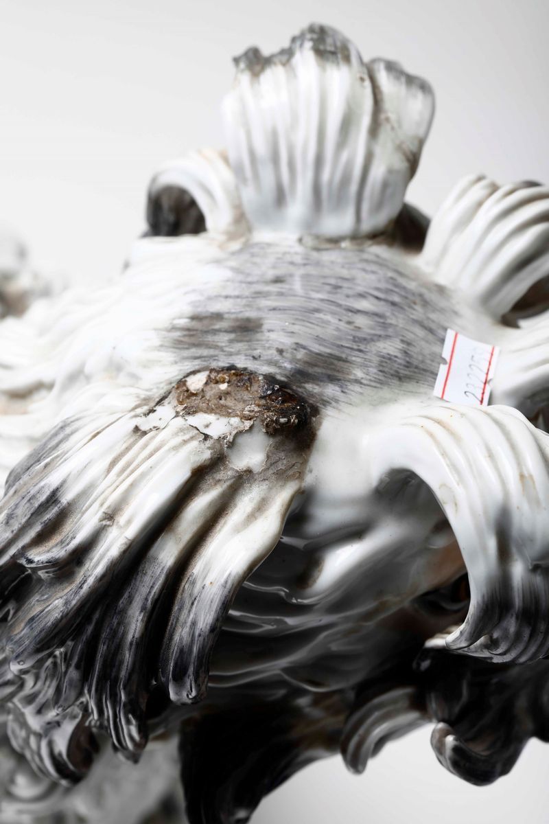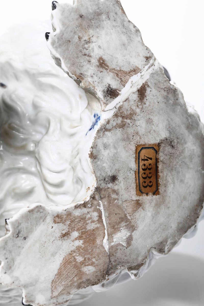 Porcellana. Marca: leone rampante con corona in blu, quale pseudo marca di Frankenthal del XVIII secolo. Dimensioni: altezza cm 37; cm 52 x 20,5. Conservazione: piede con vecchio restauro di fabbrica rincollato recentemente; 1 ciuffo sul capo mancante; riprese in restauro di alcune riparazioni di fabbrica