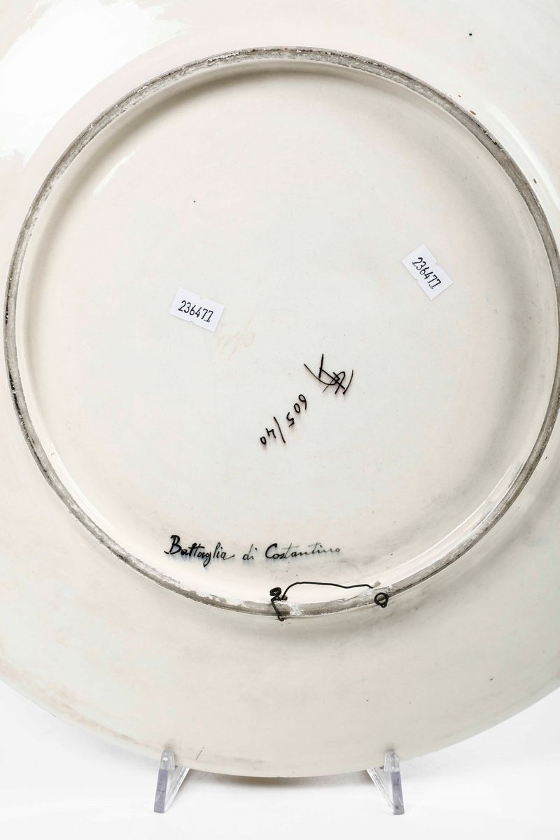 Maiolica policroma. Marca: ICA intrecciate e numeri 605/40; Battaglia di Costantino, in manganese. Diametro cm 41,2. Conservazione: ottima