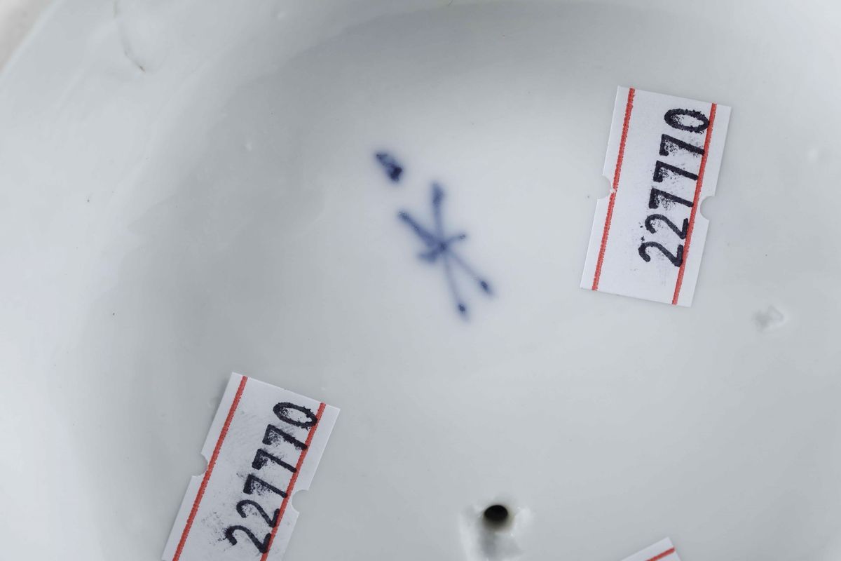 Porcellana. Marca: tre barre che si incrociano e lettera “S” in blu. Dimensioni: altezza cm 19,2. Conservazione: indice della mano destra e parte del mignolo della sinistra mancanti