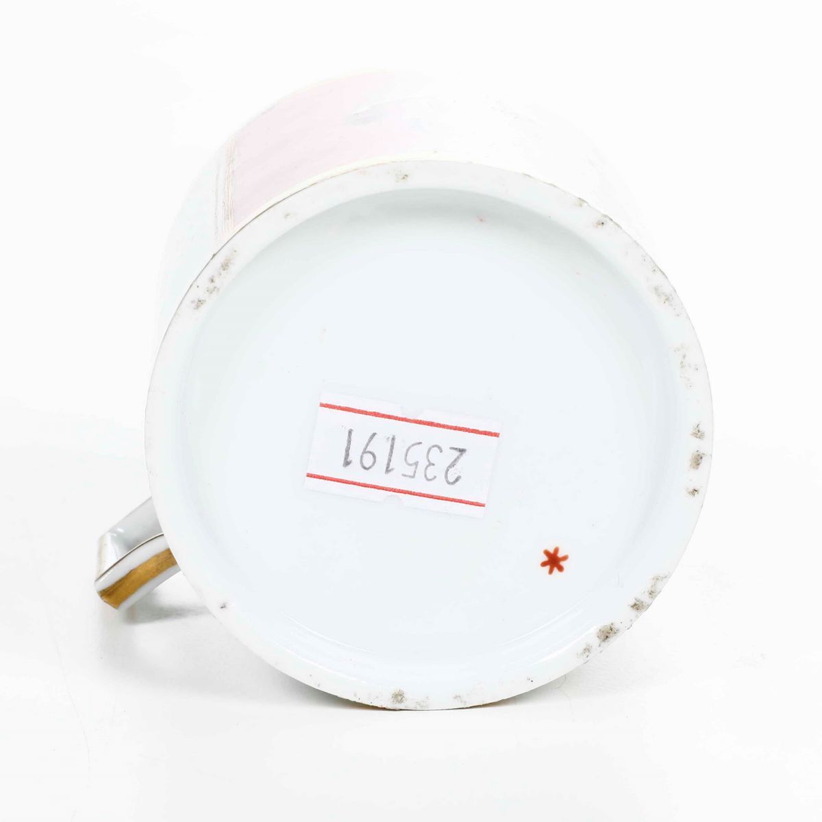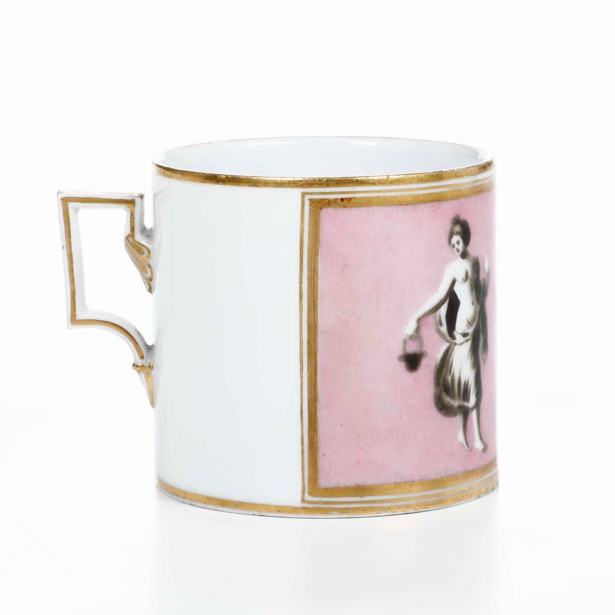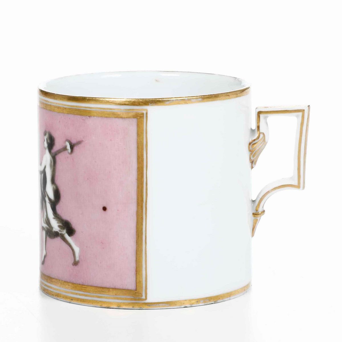 Porcellana decorata a figure classiche in riserva a fondo rosa. Marca: asterisco rosso. Altezza cm 6. Conservazione: ottima; insignificanti usure all'oro