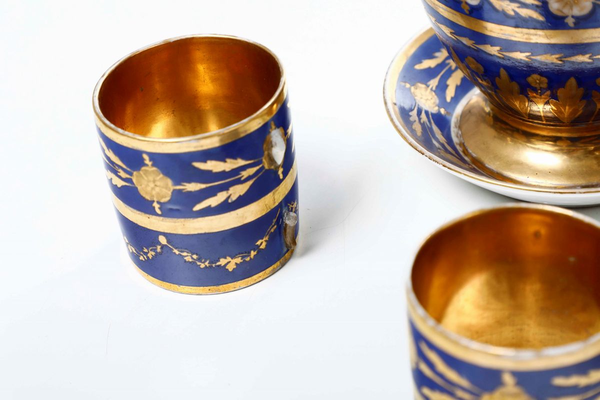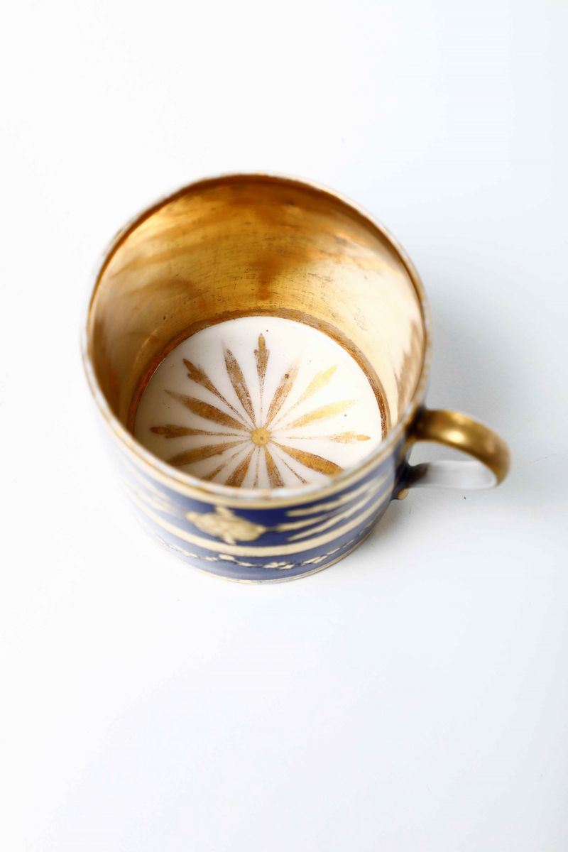 Porcellana in blu mat e oro. Marca: scettro in blu sotto al piattino. Conservazione: buona