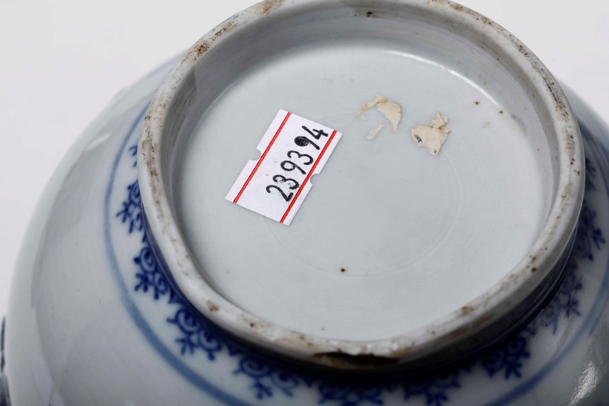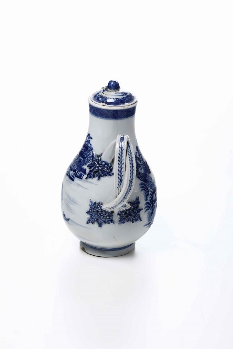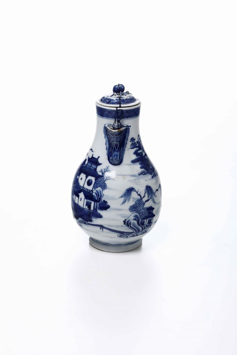 Porcellana decorata in monocromia blu. Marca assente. Altezza cm 22,3. Conservazione: coperchio non pertinente con piccola sbeccatura; felatura al bordo superiore; sbeccatura alla base