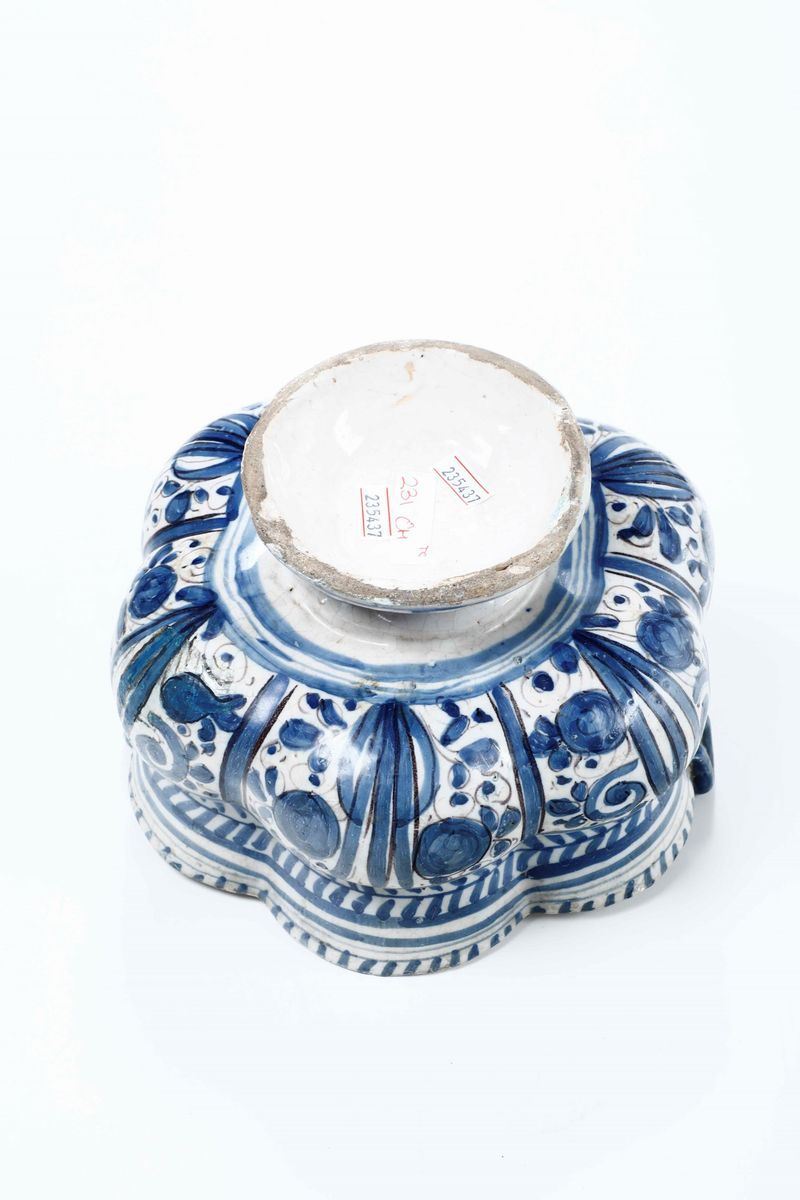 Maiolica decorata in monocromia blu di cobalto. Marca assente. Dimensioni: altezza cm 15,5; diametro cm 21. Conservazione: qualche caduta di smalto e piccole sbeccature al bordo superiore riprese in restauro